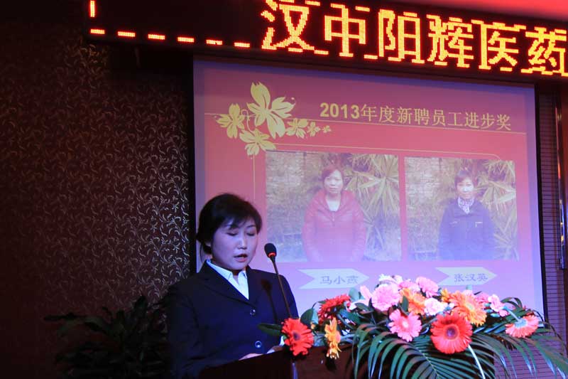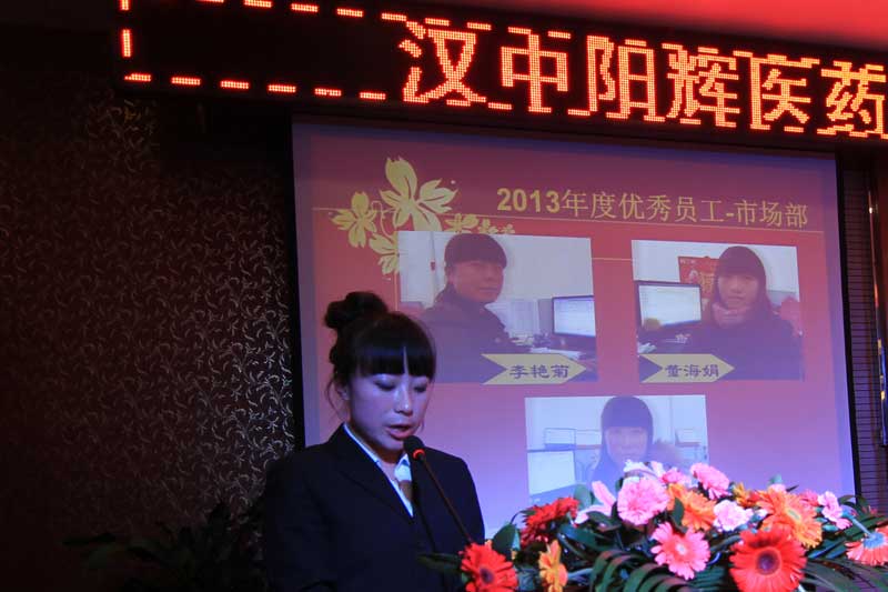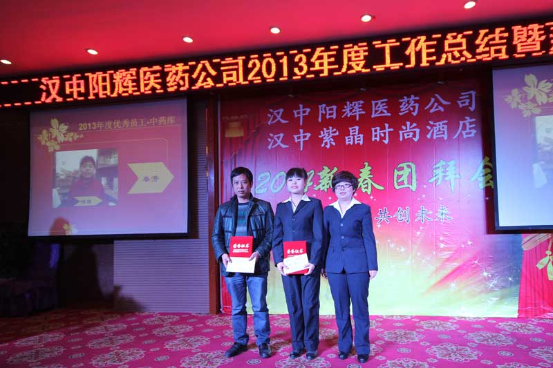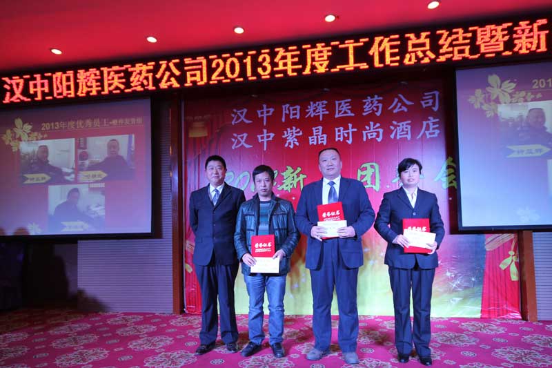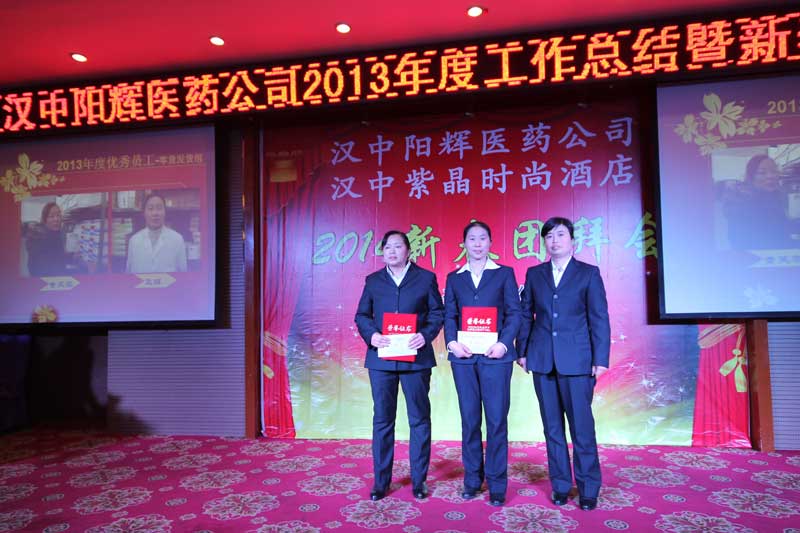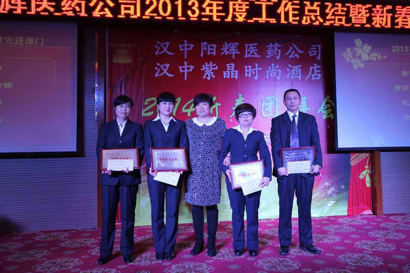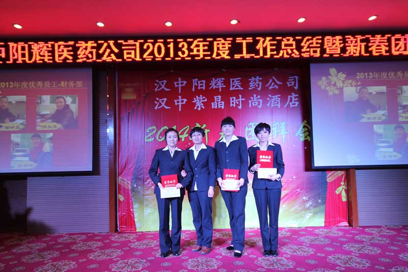 2014年會報道(2/3) 漢中陽輝醫藥有限責任公司 >2013年度工作總結暨2014新春團拜會 2014年1月18日下午,漢中陽輝醫藥有限責任公司2013年度工作總結暨2014新春團拜會在漢中紫晶時尚酒店舉行。 二、2013年度先進部門和優秀員工頒獎儀式